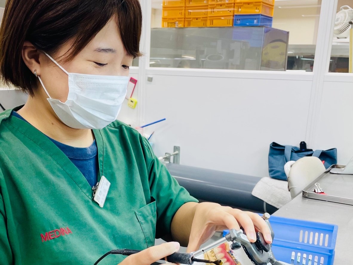 私はメディナ入社前、個人でハートデンタルという技工所を経営していましたが、仕事に行き詰まりもうやめようかと思っているときに山本本部長から「うちに来ませんか?」と声をかけて頂き、入社を決めました。本当に助けられました。そして社長はユーモアがあり色々な仕事を教えて下さる人格者で、今では入社出来て本当に良かったと思います。